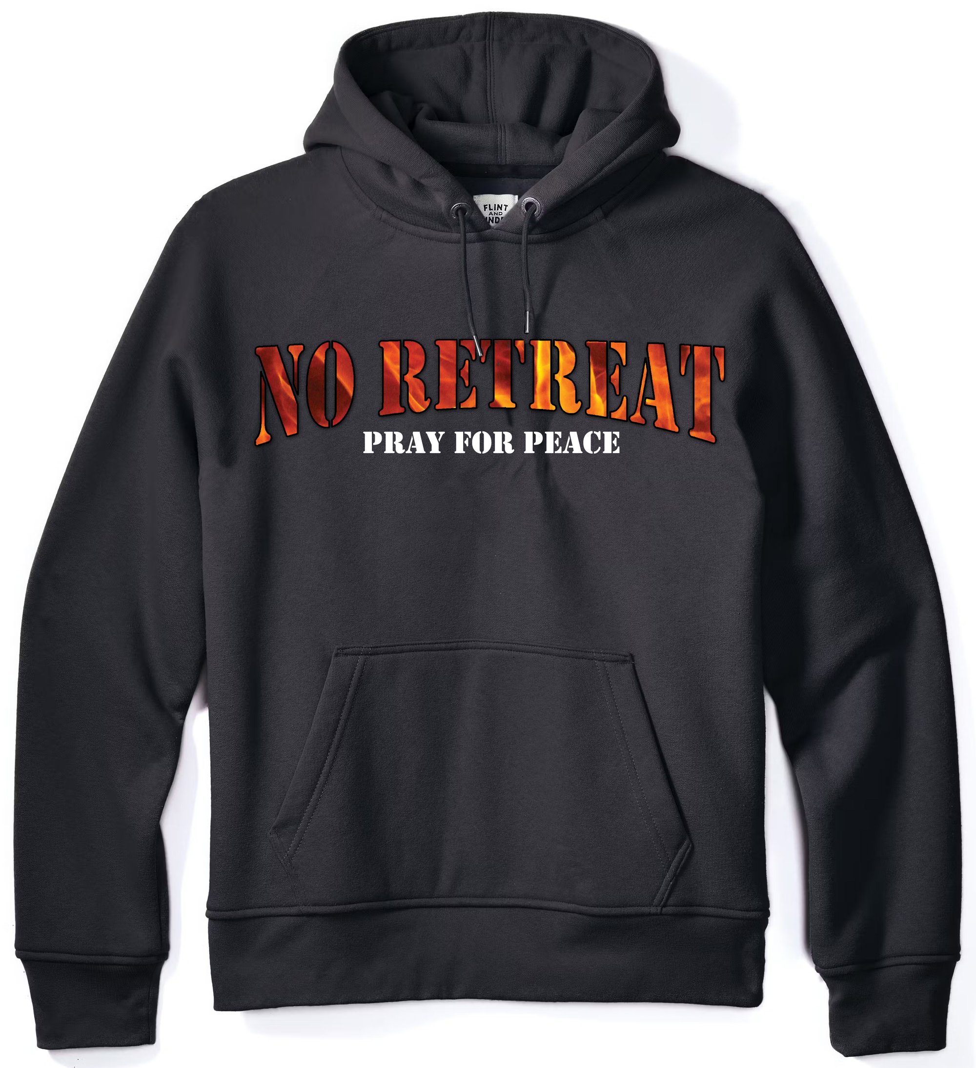 Black hoodie emblazoned with the No Retreat "Pray For Peace" logo.