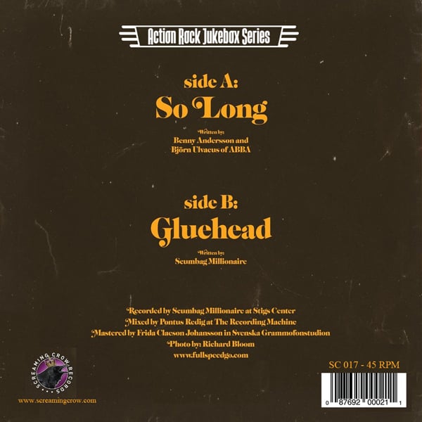 Scumbag Millionaire are high energy, dirty Rock N' Roll from Gothenburg, Sweden. These mad Swedes take ABBA's hit "So Long" and ramp it up for our Action Rock Jukebox 45 series. Backed with the equally impressive original "Gluehead." Includes custom 45 adapter, jukebox title card and stickers! Comes in both Black and Orange vinyl versions!