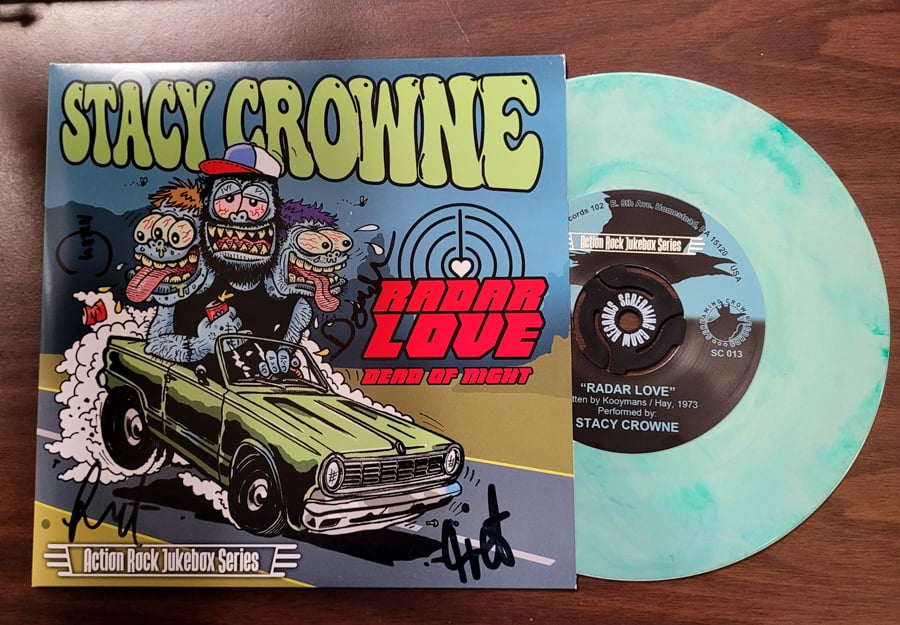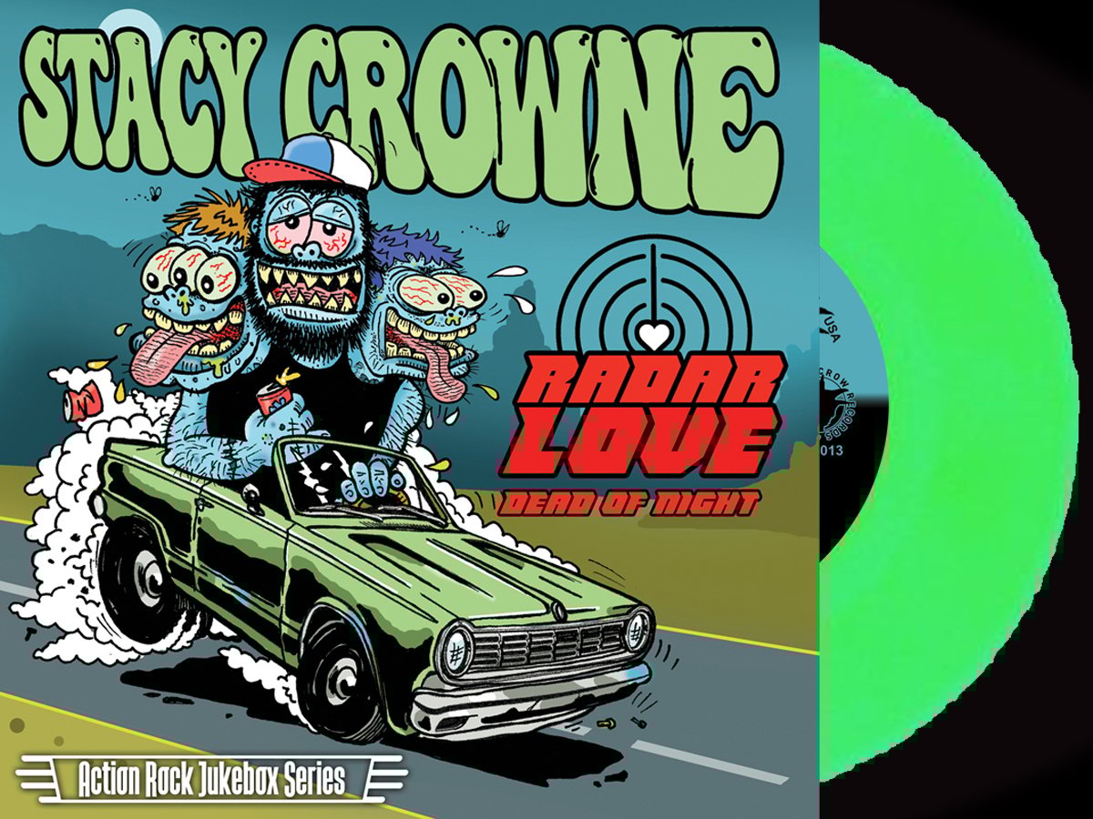 The first release of Screaming Crow's "Action Rock Jukebox" 45 series. features Stacy Crowne's amazing cover of Golden Earring's "Radar Love" backed with a new original, "Dead of Night!" Includes custom 45 adapter, jukebox title card and stickers! Available in both Black and Mint Blue vinyl.